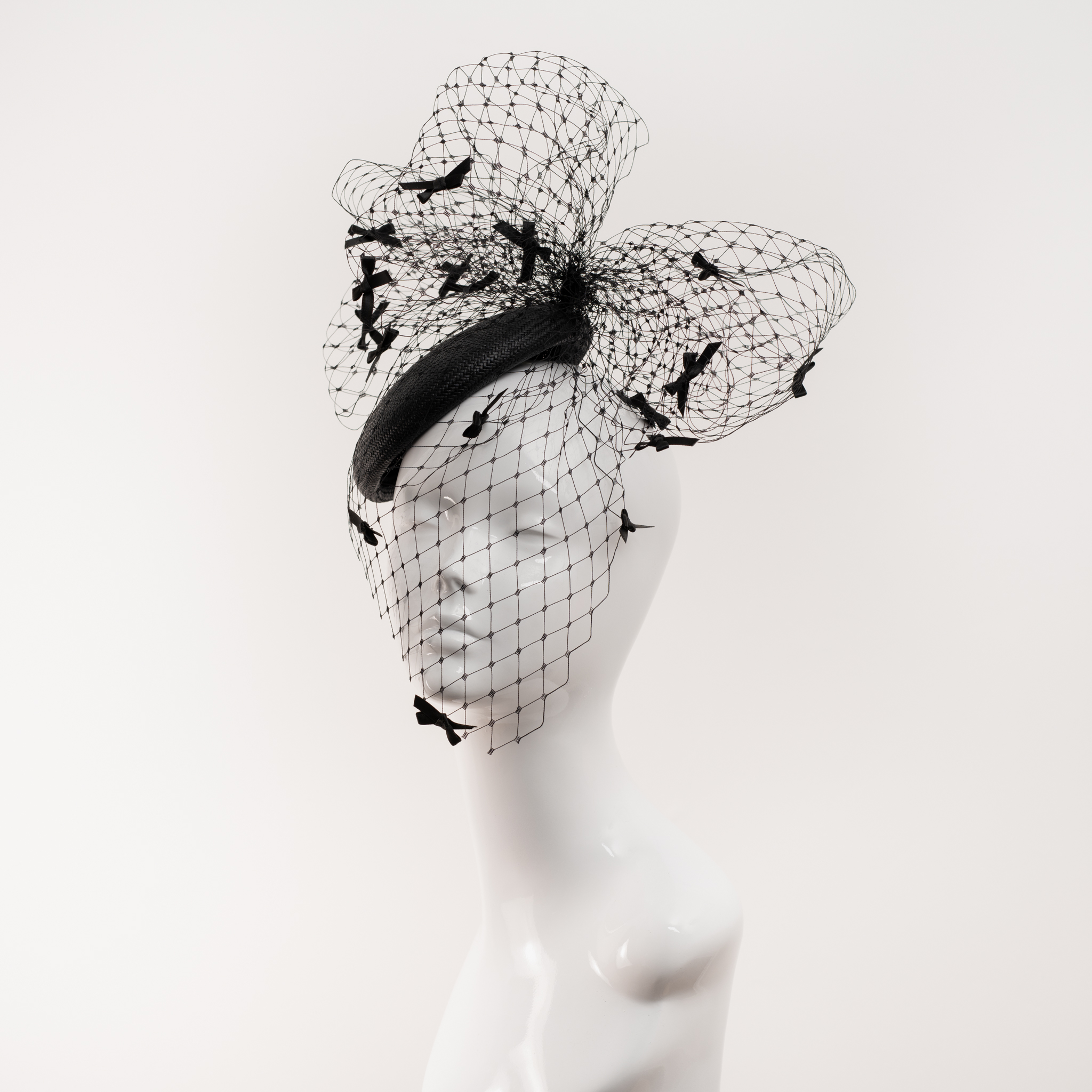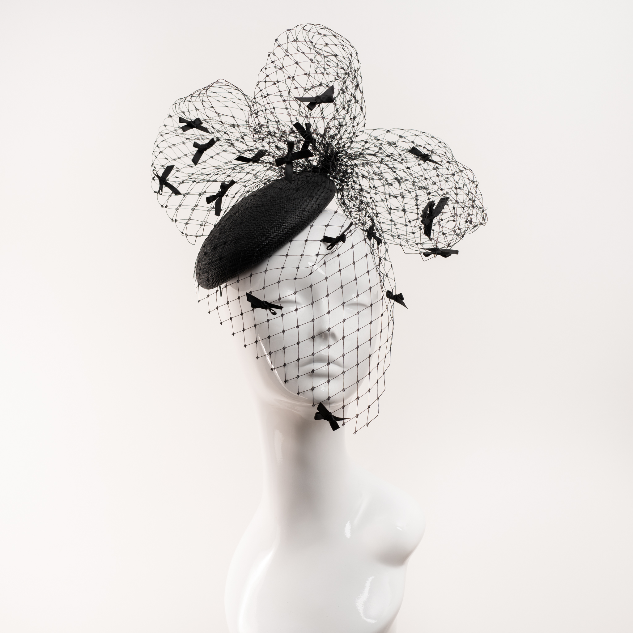 VCH Black Parisisal Straw Button with XL Veiling Trim and Satin Bows. Head Elastic.