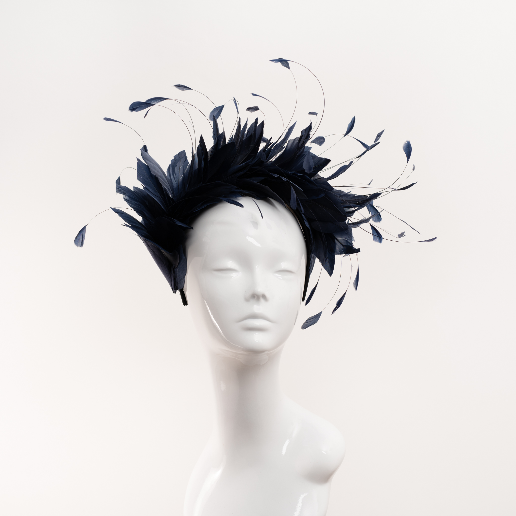 VCH Full Goose Feather Halo in Navy with Long Coque Feathers. Navy Satin Headband.